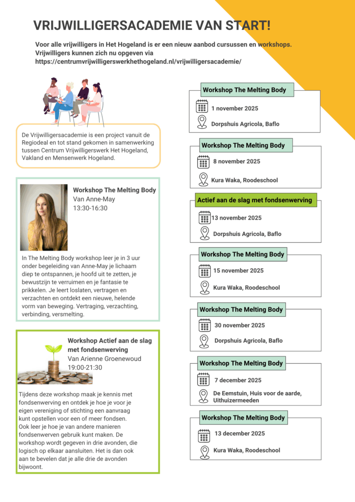 Met trots presenteren Centrum Vrijwilligerswerk Het Hogeland, Vakland Het Hogeland en Mensenwerk Hogeland het gezamenlijke initiatief vanuit de Regiodeal. Vrijwilligersacademie is een aanbod van gratis workshops en cursussen voor alle vrijwilligers in Het Hogeland.